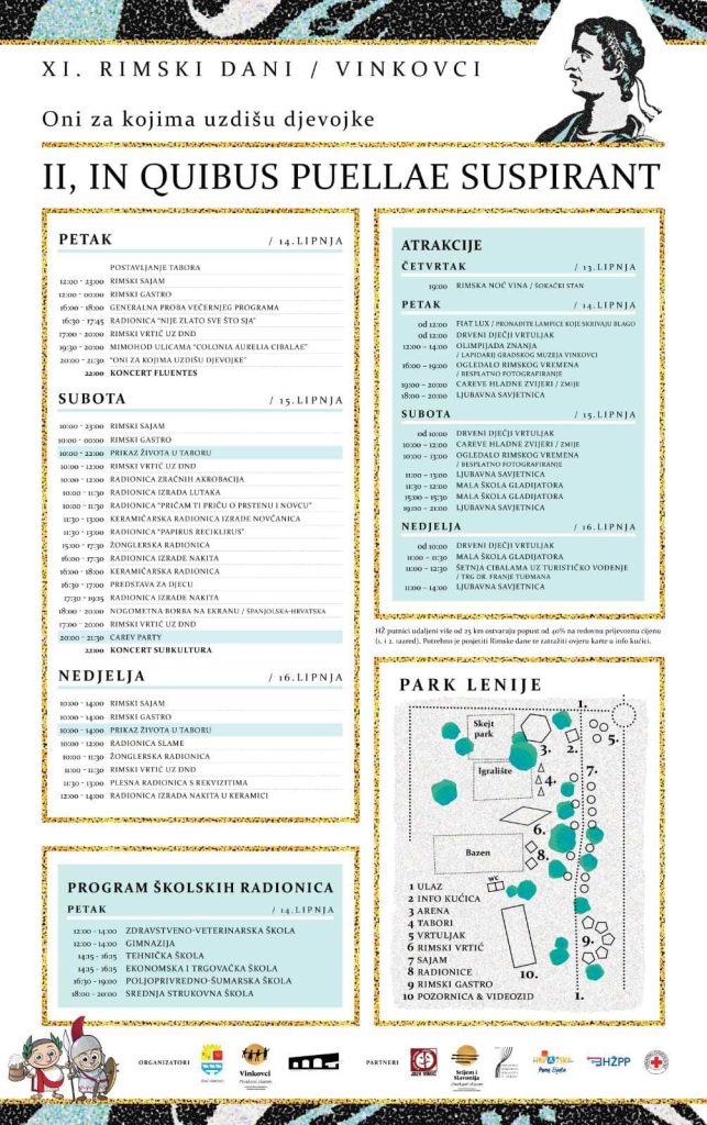 „Važno je istaknuti i kako u suradnji s Gradskim muzejom Vinkovci iz godine u godinu nastojimo razvijati edukativni dio ove naše manifestacije pa uz keramičarske radionice, izradu nakita i radionice prilagođene djeci, ove godine uz pomoć Društva Naša djeca Vinkovci organiziramo rimski vrtić u kojemu će se djeca moći igrati s različitim rekvizitima, baš kao u rimsko doba. S nama će i ovoga puta biti HNK Osijek i Gradsko kazalište Joza Ivakić čiji će se članovi pobrinuti za spektakularan večernji program u petak 14. lipnja“, najavila je Martina Matković.