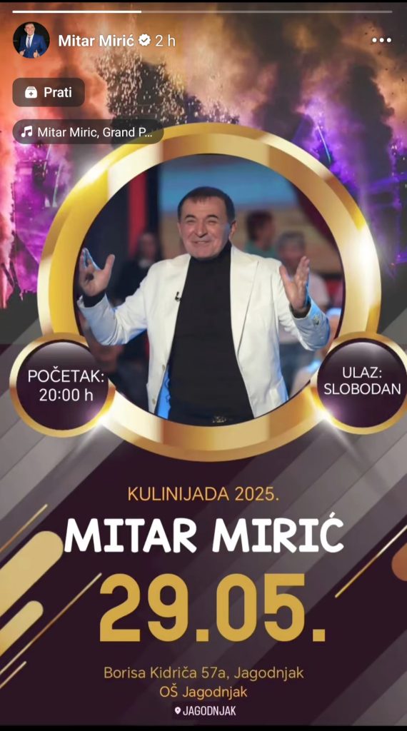 U sklopu ovogodišnje manifestacije Kulinijada 2025., Jagodnjak će ugostiti jednog od najpoznatijih pjevača narodne glazbe – Mitra Mirića! Glazbeni spektakl zakazan je za četvrtak, 29. svibnja 2025. godine u dvorištu Osnovne škole Jagodnjak, na adresi Borisa Kidriča 57a.