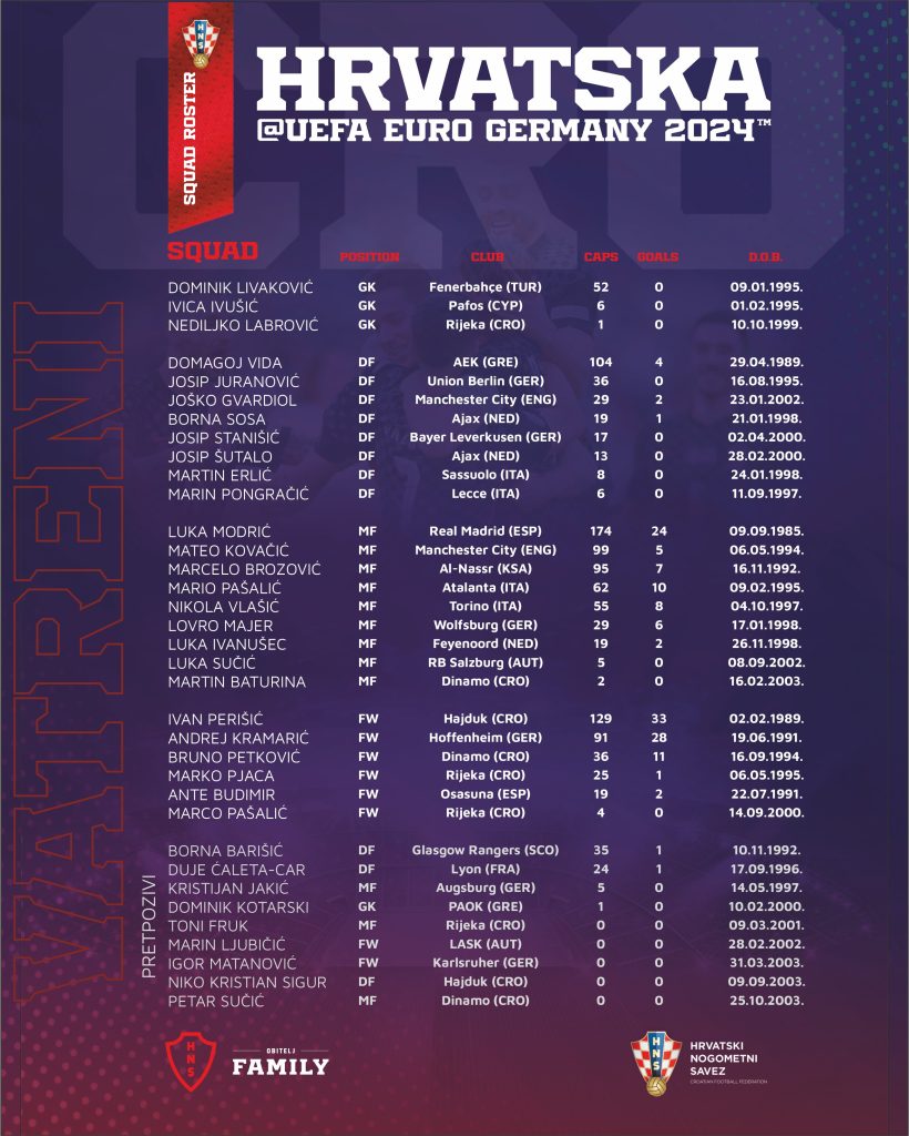 Vezni igrači: Luka Modrić (Real Madrid), Mateo Kovačić (Manchester City), Marcelo Brozović (Al-Nassr), Mario Pašalić (Atalanta), Nikola Vlašić (Torino), Lovro Majer (Wolfsburg), Luka Ivanušec (Feyenoord), Luka Sučić (RB Salzburg), Martin Baturina (Dinamo).