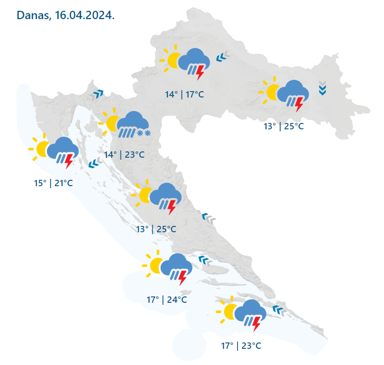 “Povremeno će padati kiša, ponegdje vrlo vjerojatno i u obliku izraženijih te obilnijih pljuskova praćenih grmljavinom, u utorak u drugom dijelu dana ponajprije u unutrašnjosti i na sjevernom Jadranu, a navečer i tijekom srijede u Dalmaciji. Uz dotok hladnog zraka kiša će u utorak navečer u gorju prelaziti u susnježicu i snijeg. Na području Gorske Hrvatske mjestimice se očekuje i stvaranje snježnog pokrivača, poglavito u Gorskom kotaru ponegdje i višeg od 10 cm. Vrlo malo susnježice ili snijega prolazno je moguće i u nekim nizinama središnje te istočne Hrvatske u noći na srijedu”, piše DHMZ u posebnom priopćenju.