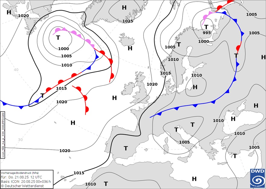 U prizemnom polju tlaka ciklona će se iz Sredozemnog mora premjestiti u četvrtak, 21. kolovoza, nad sjever Italije i sjeverni Jadran te potom nastaviti put preko naših krajeva dalje na sjeveroistok u petak, 22. kolovoza, kada će se od sjevera preko naših područja premjestiti hladna fronta s kojom će stići malo hladniji zrak.