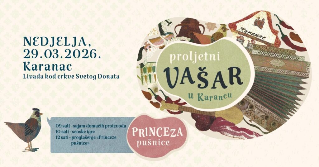 Proljetni Vašar svake godine okuplja ljubitelje dobre hrane, tradicije i zanatskih proizvoda. Više od 80 lokalnih proizvođača predstavit će svoje proizvode – od domaćih suhomesnatih proizvoda, sireva, meda, rakija i vina do svježe pečenih lepinja, kolača i tradicionalnih slastica. Posjetitelji će također moći kupiti razne rukotvorine poput pletenih košara, drvenih igračaka te cvijeća.
