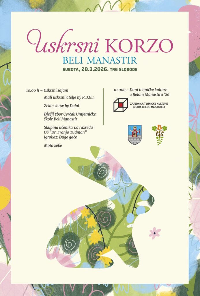 Uskrsni korzo će se održati u subotu, 28. ožujka 2026. godine, s početkom u 10:00 sati na Trgu slobode. Očekuje vas raznolik i bogat program za sve generacije – od uskrsnog sajma i kreativnih radionica do zabavnog i glazbenog programa za najmlađe. U sklopu događanja održat će se Mali uskrsni atelje, popularni Zekin show, nastup Dječjeg zbora Cvrčak Umjetničke škole Beli Manastir, kao i igrokaz učenika 1.a razreda Osnovne škole „Dr. Franjo Tuđman“.