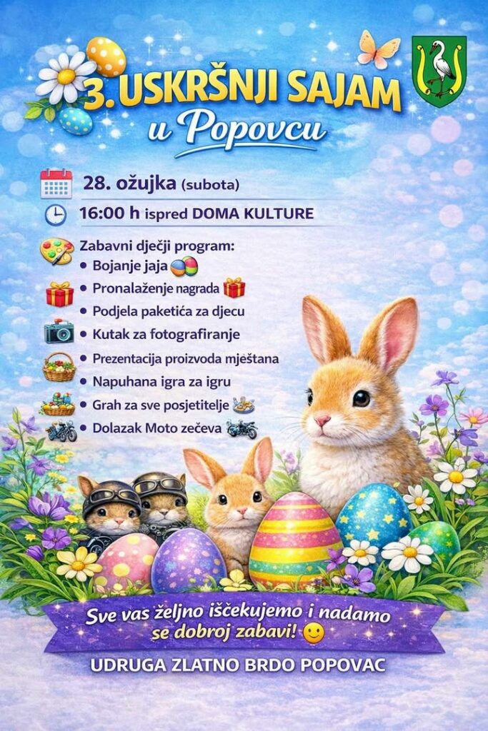 Udruga Zlatno Brdo iz Popovca organizira 3. Uskršnji sajam koji će se održati u subotu 28. ožujka 2026. godine s početkom u 16 sati ispred Doma kulture.