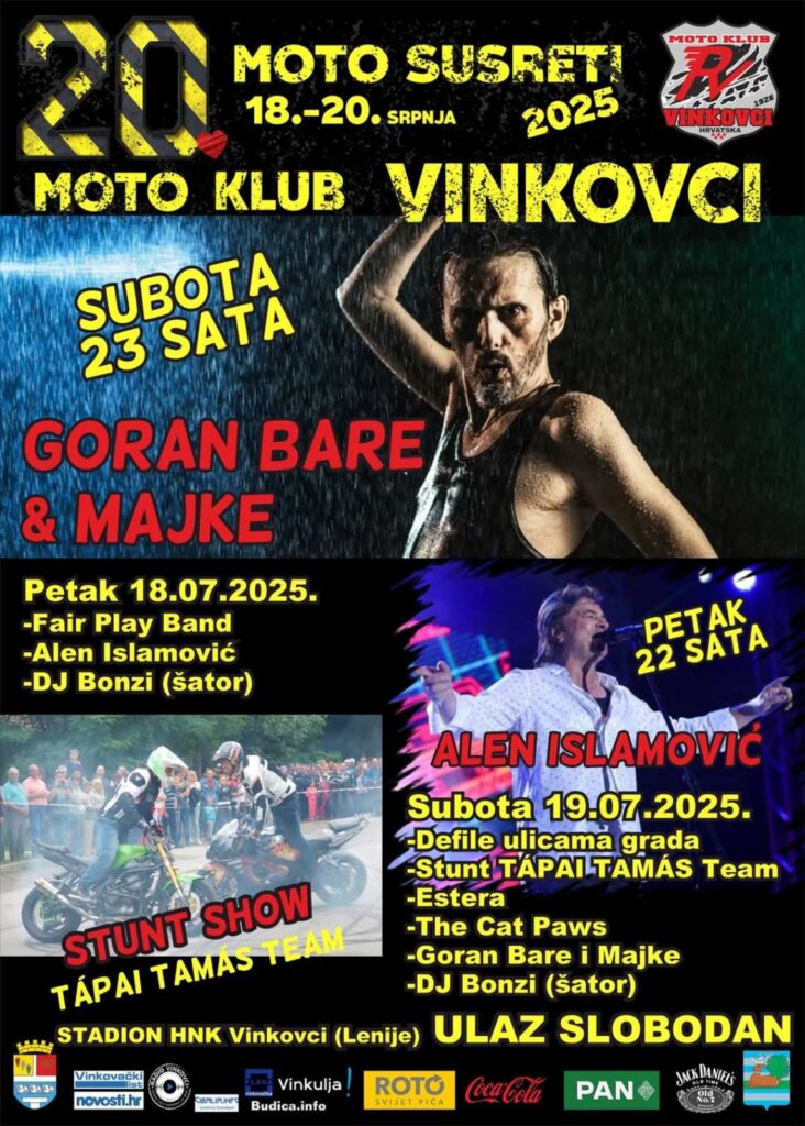 Vinkovci će i ovog srpnja biti središte ljubitelja motora, rock’n’rolla i nezaboravne zabave! Moto klub Vinkovci organizira jubilarne 20. Moto susrete koji će se održati 19. i 20. srpnja 2025., a domaćin će ponovno biti stadion HNK Vinkovci i obližnji park Lenije.