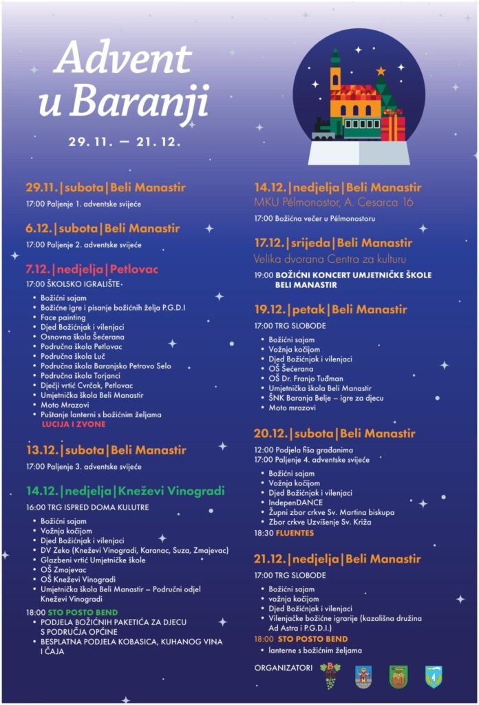 Adventska događanja planirana su u Petlovcu, Kneževim Vinogradima i Belom Manastiru. U Petlovcu će se program održati 7. prosinca, dok je advent u Kneževim Vinogradima na rasporedu 14. prosinca. Središnji dio programa održat će se u Belom Manastiru, gdje adventsko događanje počinje 17. prosinca koncertom učenika Umjetničke škole.