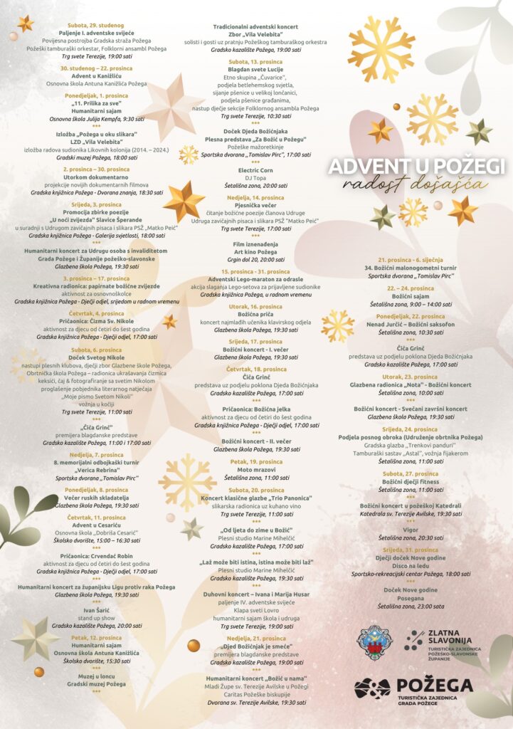 Požega je i ove godine pripremila bogat program povodom Adventa, koji traje od 29. studenoga pa sve do početka siječnja. Pod sloganom „Radost došašća“, građane očekuju brojna kulturna, glazbena, humanitarna i zabavna događanja na više gradskih lokacija.