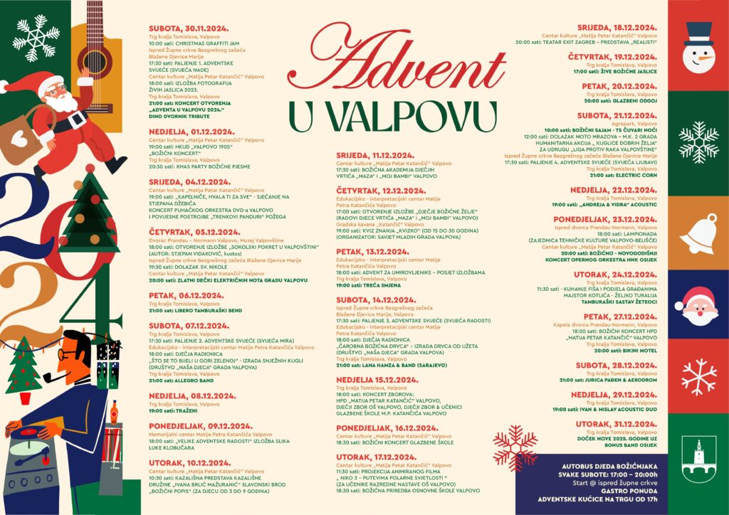 U organizaciji Grada Valpova, Turističke zajednice Grada Valpova, Ustanove za kulturne djelatnosti „Ante Evetović Miroljub“ Valpovo i Valpovačkog poduzetničkog centra, od 30. studenoga do 31. prosinca 2024. godine održat će se programom bogata manifestacija „Advent u Valpovu 2024.“