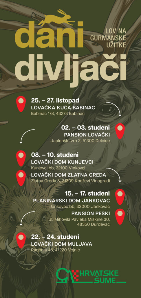 Hrvatske šume organiziraju manifestaciju Dani divljači – lov na gurmanske užitke, koja se održava svakog vikenda od 25. listopada a trajati će do 24. studenog na različitim lokacijama diljem Hrvatske.