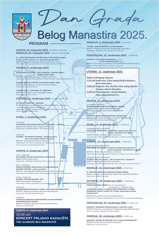 Bliži se Dan Grada Belog Manastira koji se obilježava u subotu, 8. studenoga. Na sam Dan Grada održat će se sveta misa te blagoslov vina. U popodnevnim satima prikaz legende o Svetom Martinu.