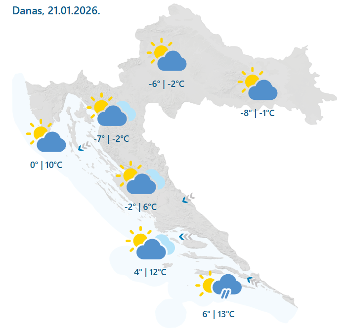 U četvrtak i petak u unutrašnjosti je moguća slaba oborina na granici kiše i snijega koja se može smrzavati u dodiru s hladnom podlogom.
