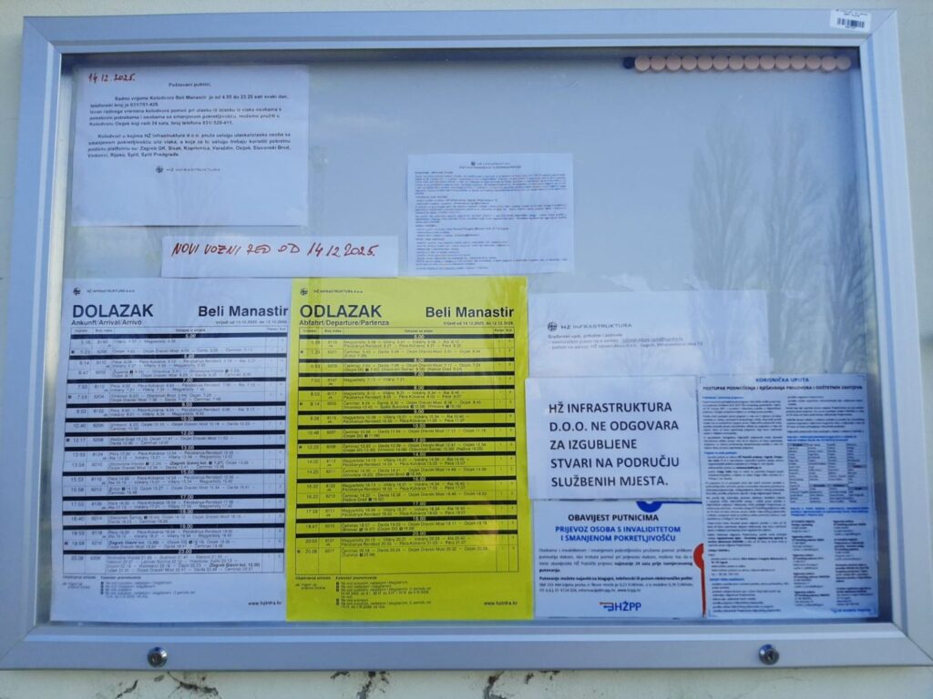 Prema informacijama s objavne ploče željezničkog kolodvora i službenim stranicama HŽ Putničkog prijevoza, od 14. prosinca 2025. uvodi se novi vozni red. Do 13. prosinca ostaju istaknuti postojeći redovi vožnje, no putnici već sada mogu vidjeti koje ih promjene očekuju. Na relacijama prema Osijeku i Mađarskoj nema većih izmjena, uz tek manja usklađivanja, no jedna se promjena posebno izdvaja.