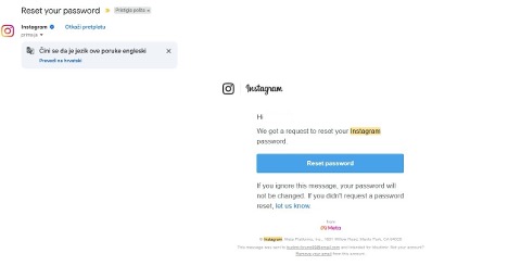 E-mail koji korisnici dobivaju izgledaju vrlo uvjerljivo jer koriste identičan font, logotipe i izraze kao Instagram. U e-mailu piše: “Dobili smo zahtjev za ponovnim postavljanjem vaše lozinke za Instagram“, a ispod se nudi gumb za poništavanje lozinke ili poveznica za “resetiranje” lozinke.