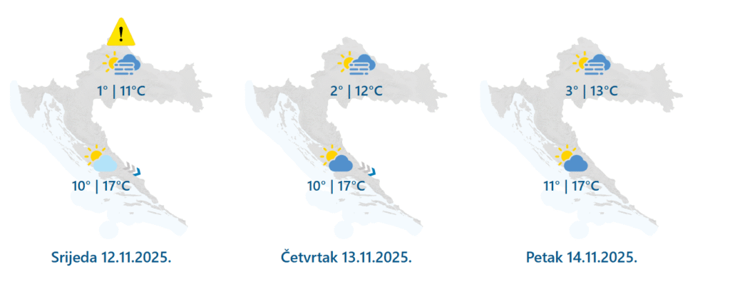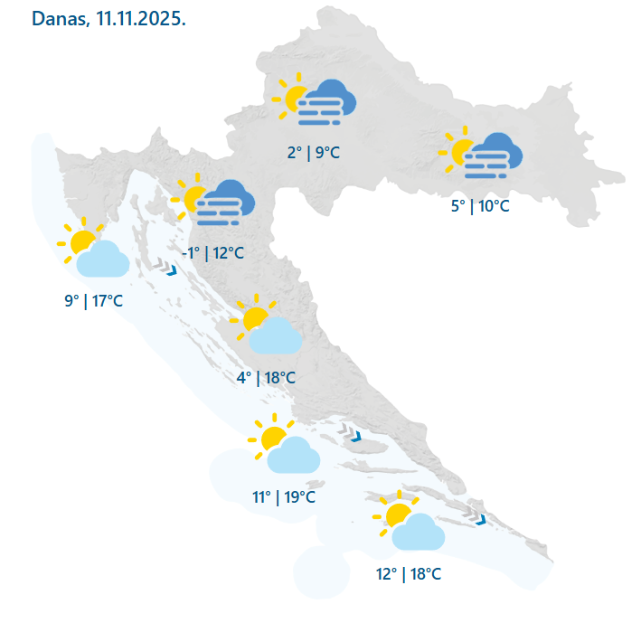 U utorak će u unutrašnjosti prevladavati magla i niski oblaci, mjestimice i slaba rosulja, a poslijepodne češća sunčana razdoblja. Navečer i u noći ponovno stvaranje magle. Na Jadranu i u gorju pretežno sunčano. Vjetar slab, na Jadranu ujutro slaba do umjerena bura, danju do umjeren sjeverozapadnjak. Najviša dnevna temperatura između 7 i 12, na Jadranu od 16 do 19 °C, prognozira DHMZ.