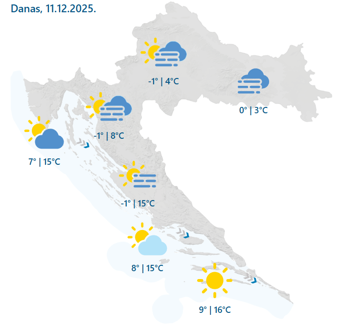Danas će u nizinama unutrašnjosti biti pretežno oblačno vrijeme, a u prvom dijelu dana i ponovno navečer često magla. Na Jadranu i predjelima uz njega pretežno sunčano, prijepodne po kotlinama lokalno magla, u Istri i niski oblaci.