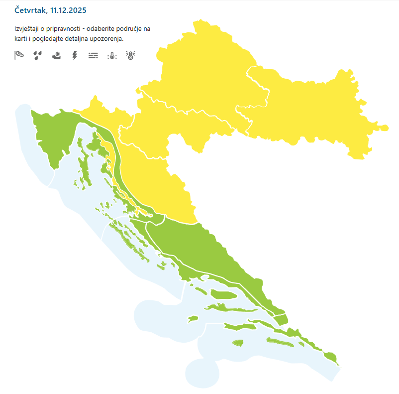 Vjetar većinom slab, na Jadranu i umjeren sjeverozapadni, od sredine dana podno Velebita bura. Najviša dnevna temperatura zraka između 3 i 8, na Jadranu te u unutrašnjosti Istre i Dalmacije od 13 do 17 °C, prognozira DHMZ za četvrtak.