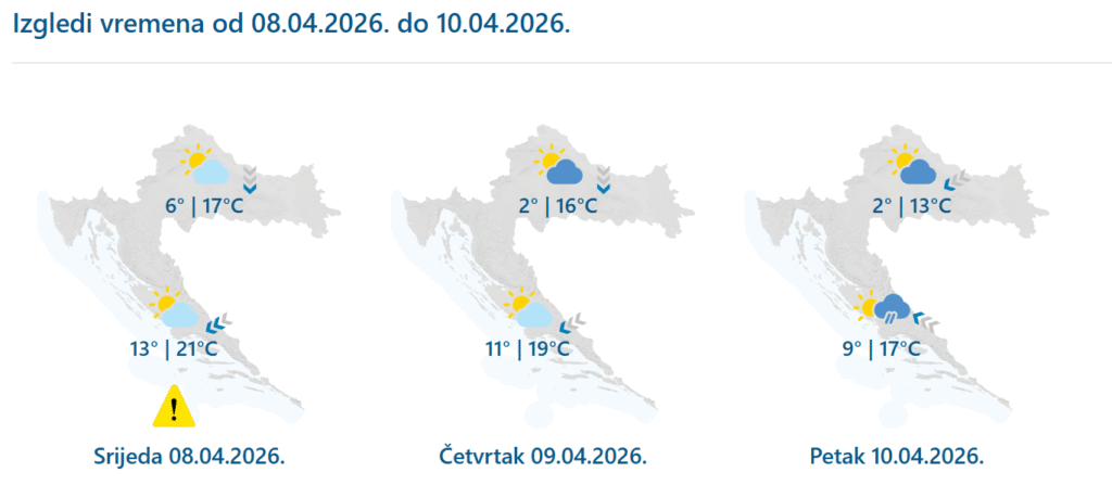 Vjetar uglavnom slab, na Jadranu ujutro ponegdje umjerena bura, popodne jugozapadnjak i sjeverozapadnjak. Navečer će zapuhati umjeren sjeveroistočni i sjeverni vjetar, zatim na moru jačanje bure. Najviša dnevna temperatura uglavnom između 18 i 23 °C.
