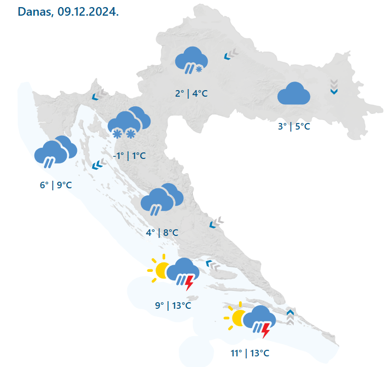 U ostatku zemlje umjereno do pretežno oblačno, mjestimice s kišom, a na moru i izraženijim pljuskovima s grmljavinom, većinom na otocima. U unutrašnjosti i snijeg, uglavnom u Gorskoj Hrvatskoj gdje će se stvarati i novi snježni pokrivač, dok će prema sjeveru i osobito istoku oborina biti sve rjeđa. Vjetar slab do umjeren sjeverni i sjeveroistočni. Na sjevernom i dijelu srednjeg Jadrana umjerena i jaka bura s olujnim udarima, a prema jugu većinom umjereno jugo i južni vjetar. Najviša temperatura zraka između 2 i 5 u kopnenim krajevima te od 8 do 13 °C na moru i u unutrašnjosti Istre i Dalmacije, stoji u prognozi.