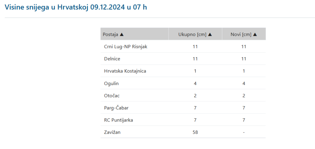U gorskim predjelima Hrvatske je sinoć pao snijeg, tako ga u Lici i Gorskom kotaru ima 10-ak cm snijega, na Sljemenu 7 cm, dok na Zavižanu ima 58 cm.