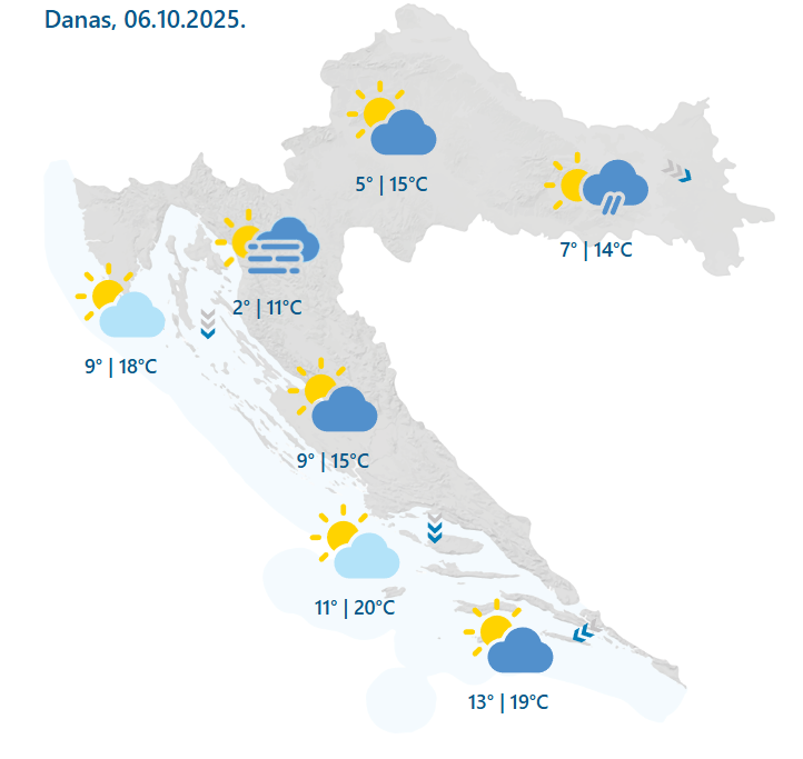 Prema prognozi Državnog hidrometeorološkog zavoda u ponedjeljak će biti djelomice, a na većem dijelu Jadrana i pretežno sunčano. Ujutro na kopnu mjestimice kratkotrajna magla. Uz više oblaka malo kiše ili pokoji pljusak tijekom dana na istoku zemlje. Vjetar slab do umjeren sjeverozapadni, a na Jadranu umjerena do jaka, na udare i olujna bura i tramontana. Maksimalna temperatura uglavnom od 11 do 15, a Jadranu između 18 i 21 °C.