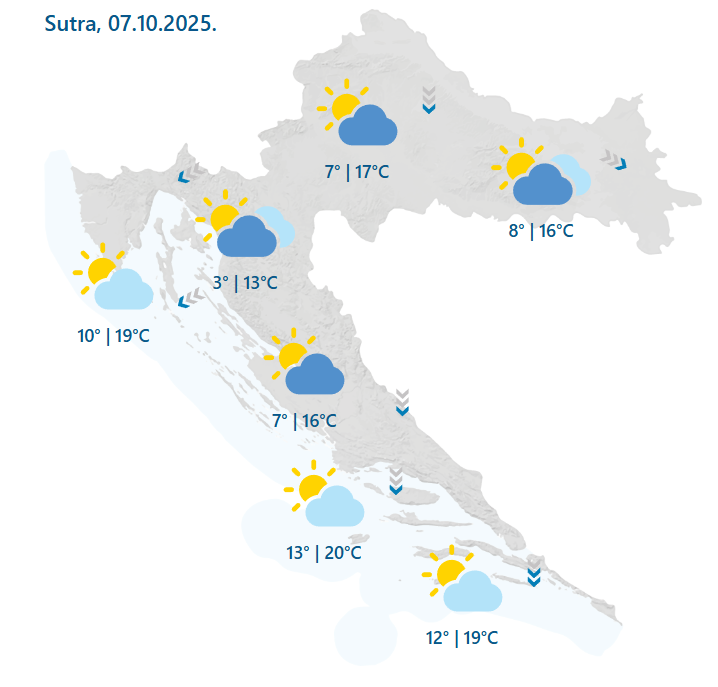 Prema izgledima vremena koje prognozira DHMZ, u utorak će unutrašnjosti biti većinom sunčano, uz više oblaka uglavnom u gorju i Slavoniji mjestimice malo kiše ili pokoji pljusak. Puhat će slab do umjeren sjeverni i sjeverozapadni vjetar. Na Jadranu pretežno sunčano povremeno uz umjerenu naoblaku. U utorak još jaka, mjestimice na udare i olujna tramontana, a zatim slaba do umjerena bura. Temperatura zraka posvuda u postupnom porastu.