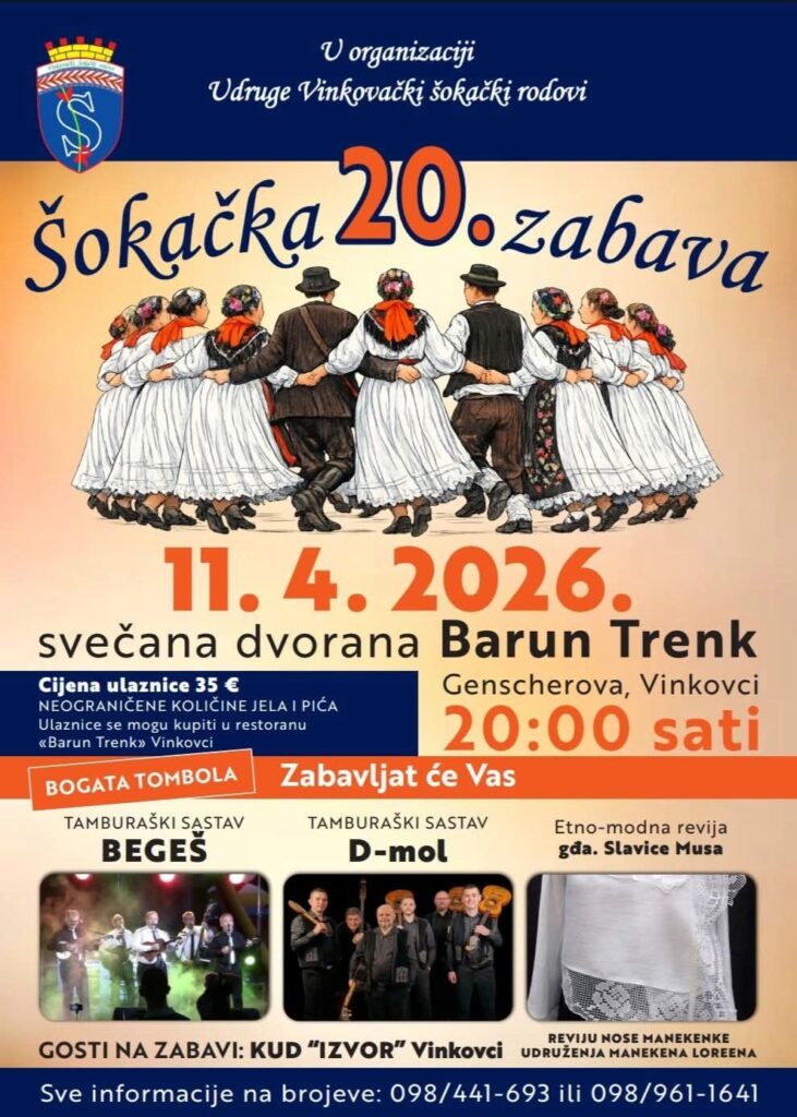 U Vinkovcima će se u subotu, 11. travnja 2026. godine održati jubilarna, 20. Šokačka zabava