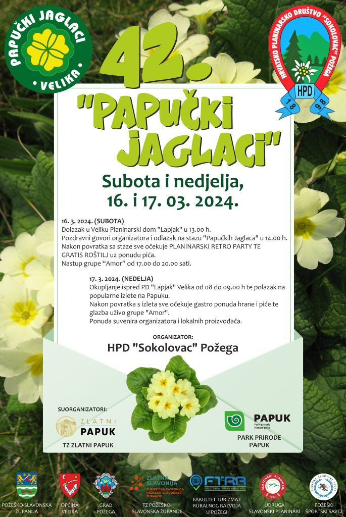 „Papučki jaglaci ostali su planinarska svečanost obilježena buđenjem prirode, a i sam naziv planinarske manifestacije obilježen je žutim jaglacem, cvijetom koji karakterizira rano proljeće. U svakom slučaju u Zlatnoj Slavoniji uživat ćete na čistom zraku i prekrasnoj prirodi. Vjerujte, nema ljepšeg i zdravijeg doživljaja destinacije od onog kojeg proživite pješačeći”, ističu organizatori iz Hrvatskog planinarskog društva „Sokolovac” Požega.