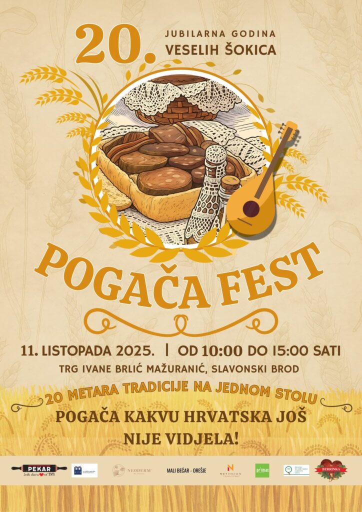 Na Trgu Ivane Brlić-Mažuranić od 10 do 15 sati održava se Pogača Fest 2025., kojim se obilježava dva desetljeća djelovanja ženske pjevačke skupine Vesele Šokice.