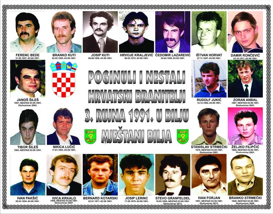 Podsjećamo, toga dana 1991. godine u obrani Bilja, zadnjeg neokupiranog naselja u Baranji, od napada oklopnih jedinica tzv. JNA i pobunjenih Srba poginulo je 11 hrvatskih branitelja. Još je 13 zarobljeno, a uz zvjerska mučenja ubijeno je 9 branitelja. Njihova tijela naknadno su pronađena i ekshumirana na raznim stratištima, no za jednog se ni danas ne zna sudbina. Tri branitelja su razmijenjena.