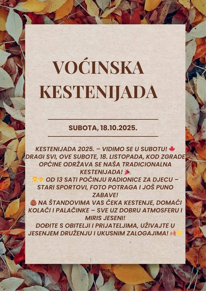 Posjetitelje očekuje bogat program, domaća kuhinja, mirisi pečenih kestena i autentična slavonska atmosfera.