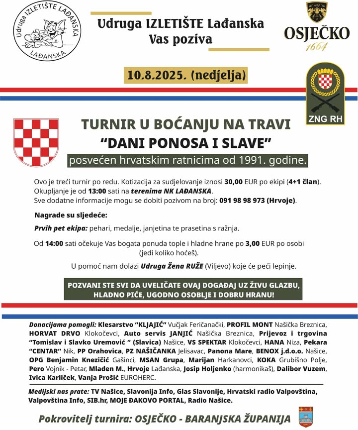 Udruga Izletište Lađanska organizira tradicionalni Turnir u boćanju na travi “Dani ponosa i slave” koji će se održati u nedjelju, 10. kolovoza 2025. godine