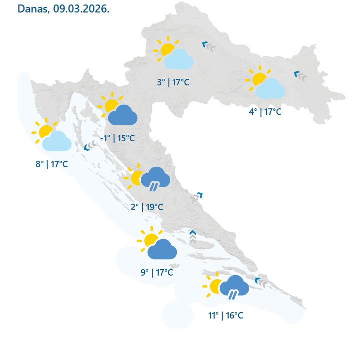 U ponedjeljak će u većini Hrvatske biti pretežno sunčano, prognoza je Državnog hidrometeorološkog zavoda. Prolazno više oblaka u Gorskoj Hrvatskoj i unutrašnjosti Dalmacije te na jugu, gdje može biti malo kiše ili ponekog pljuska.