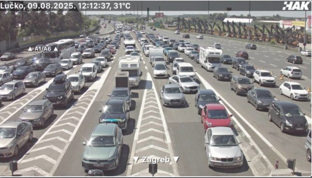 Ljetne gužve i pojačan turistički promet i dalje stvaraju zastoje na gotovo svim većim prometnicama u Hrvatskoj. Na autocesti A1 Zagreb–Ploče–Karamatići u smjeru mora vozi se usporeno u kolonama uz povremene zastoje na dionicama Lučko–Bosiljevo 2 te Gospić–tunel Sveti Rok–čvor Rovanjska. Povremeno se prekida promet kroz tunel Sveti Rok prema Dubrovniku, a kolona je oko tri kilometra. U smjeru Zagreba, zastoje bilježi dionica između čvora Zadar istok i tunela Čelinka, dok su pred naplatama Lučko i Demerje kolone oko jednog kilometra.
