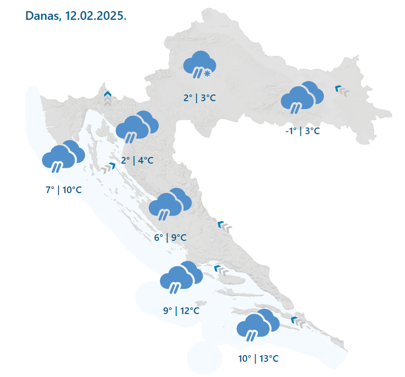 Prema prognozi Državnog hidrometeorološkog zavoda danas nas očekuje pretežno oblačno s povremenom kišom. U unutrašnjosti se kiša mjestimice može smrzavati na tlu, a uglavnom na sjeverozapadu ponegdje susnježica i snijeg. Vjetar većinom slab, u Lici ponegdje umjeren južni, a na istoku jugoistočni. Na Jadranu slabo i umjereno jugo, na sjevernom dijelu i jugozapadnjak. Temperatura zraka u većem dijelu unutrašnjosti uglavnom između -1 i 4 °C, u Lici malo viša. Na Jadranu te u unutrašnjosti Istre i Dalmacije najviša dnevna temperatura od 8 do 13 °C.