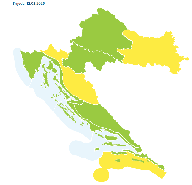 Za istočnu regiju upaljen meteoalarm zbog poledice. “Lokalno je moguća oborina koja se ledi u dodiru s hladnim tlom. Minimalna temperatura < 0 °C. BUDITE NA OPREZU zbog rasprostranjenog padanja snijega i/ili leda na cestama i pločnicima. Moguć je lokalizirani prekid aktivnosti na otvorenom. Pripazite pri hodanju, bicikliranju ili vožnji na skliskim površinama.”, stoji u upozorenju DHMZ-a.