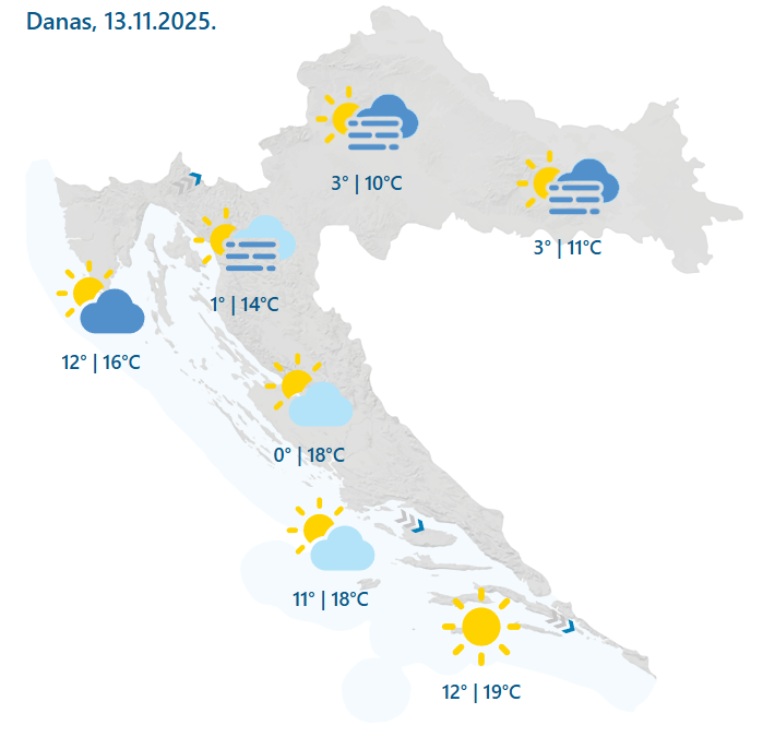 U Dalmaciji i u višem gorju većinom sunčano. U nizinama unutrašnjosti, ponegdje u kotlinama gorskih predjela te na sjevernom Jadranu prijepodne mjestimice magla i niski oblaci, zatim češća sunčana razdoblja. Na širem riječkom području moguće malo kiše.