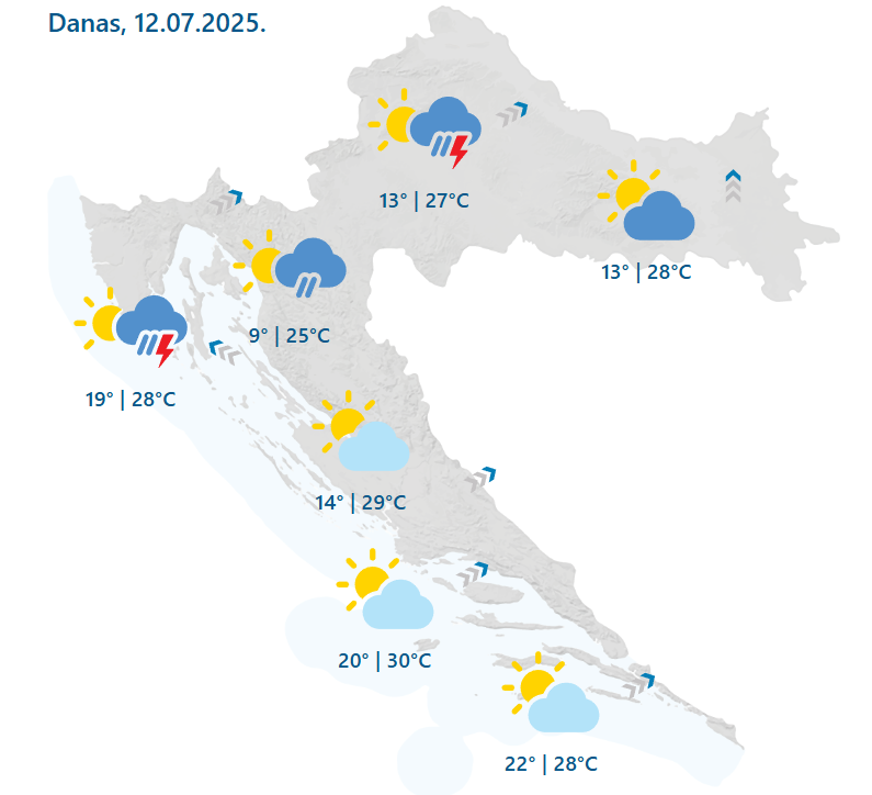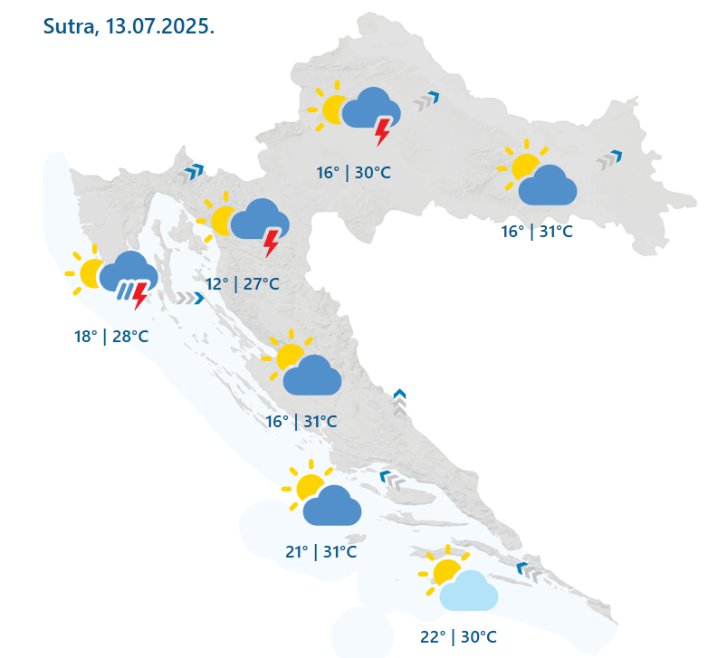 U nedjelju djelomice sunčano, ponegdje vruće i ne posve stabilno. Mjestimice je moguć pljusak, a na sjevernom Jadranu postoji i mala vjerojatnost za nevrijeme uz prolazno vrlo jak vjetar. Puhat će većinom umjeren, u gorju i jak jugozapadnjak, a duž obale i jugo. Jutro manje svježe uz najnižu temperaturu od 12 do 16, a na obali i otocima od 18 do 22 °C. Najviša temperatura zraka uglavnom između 27 i 31 °C.