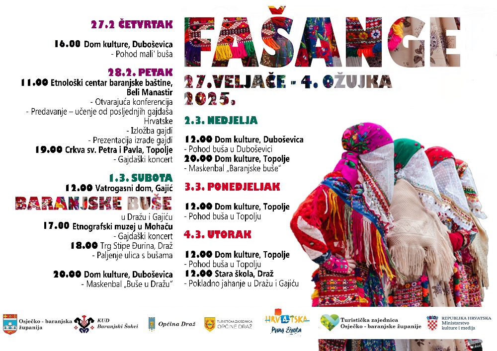 Situacija će kulminirati u subotu 1.3. kada će buše u pratnji gajdaša i tamburaša obići Gajić i Draž i zapaliti ulice na Trgu Stipe Đurina kod poznatog bircuza Kod Džonike te počastiti sve okupljene buše šokačkim grahom. Sve vas to čeka u Dražu, Gajiću, Topolju, Duboševici, Belom Manastiru i Mohaču prema programu: