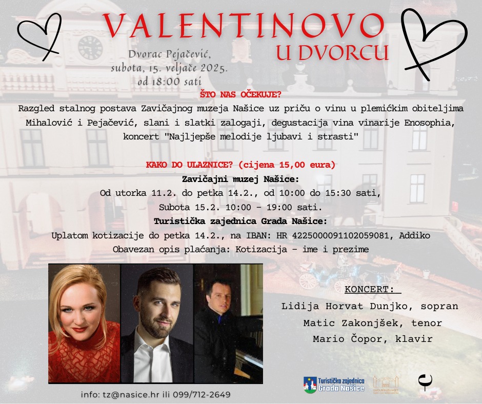 Za dodatne informacije možete se obratiti putem e-maila tz@nasice.hr ili telefona 099/712-2649. Pripremite se za večer ispunjenu ljubavlju, glazbom i vinskim užitkom u romantičnom ambijentu našičkog dvorca!