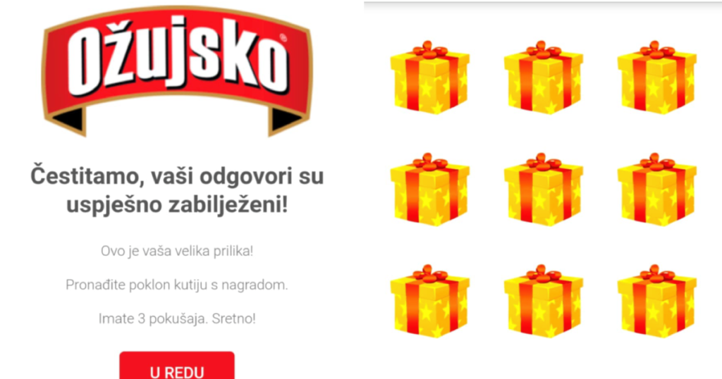 “Na internetu se pojavila lažna nagradna igra koja je neovlašteno objavljena u ime brenda Ožujsko pivo. Prijevara koristi ime, logotip i vizualni identitet brenda, čime se potrošače dovodi u zabludu na društvenim mrežama i internetskim stranicama. U sklopu lažne igre od korisnika se traži unos osobnih i bankovnih podataka, koje treća strana može neovlašteno zloupotrijebiti.