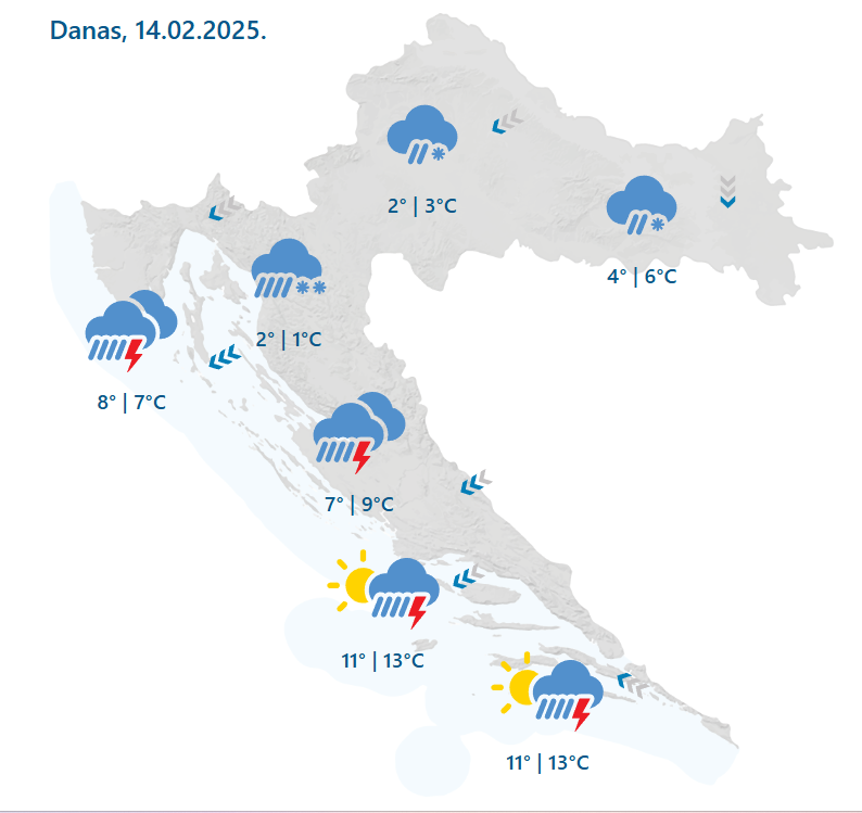 Danas će na istoku zemlje biti oblačno s kišom koja će uz zahladnjenje sredinom dana prelaziti u susnježicu i snijeg, najprije u zapadnim predjelima. Stvaranje snježnog pokrivača uglavnom u gorskim predjelima. Zapuhat će umjeren i jak sjeverni i sjeverozapadni vjetar. Temperatura zraka između 3 i 7 °C, od sredine dana u postupnom padu, prognoza je DHMZ-a.