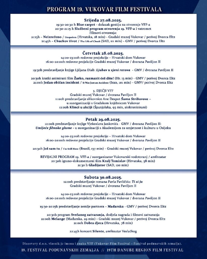 Vukovar će od 27. do 30. kolovoza 2025. ponovno biti domaćin 19. Vukovar Film Festivala. Novo izdanje Vukovarskog filmskog festivala donosi bogat program s čak 61 filmskim naslovom u četiri natjecateljske kategorije, potvrđujući time status jednog od najvažnijih filmskih događanja u regiji.