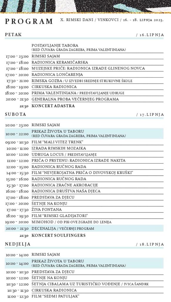 U nedjelju je posljednji dan ovogodišnjih Rimskih dana koji također započinje rimskim sajmom i prikazom života u taboru. Posjetitelji će u nedjelju moći šetati ulicama Cibala uz licenciranog vodiča. Treba svakako napomenuti kako se Vinkovci ponose s 8.200 godina kontinuiranoga života na području grada kao i da su rimske Cibale imale veliki značaj u vrijeme Rimskog carstva. O tome govore i brojni arheološki nalazi kao i saznanja. Poznato je i kako su u Vinkovcima rođena dva rimska cara – Valens i Valentinijan