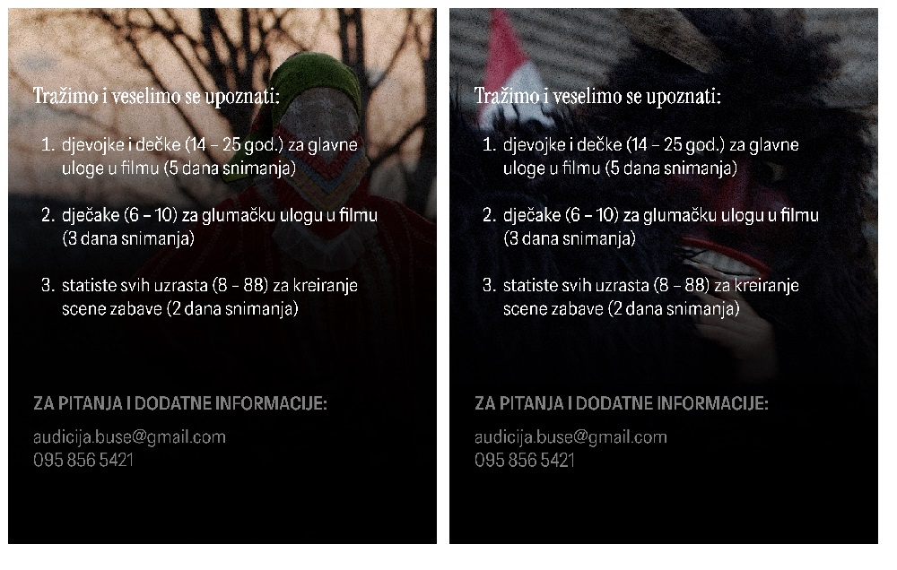 Pozivaju se svi koji žele steći iskustvo glume pred kamerom i svojom ulogom obogatiti snimanje, da se priključe audiciji za igrani film BUŠE.