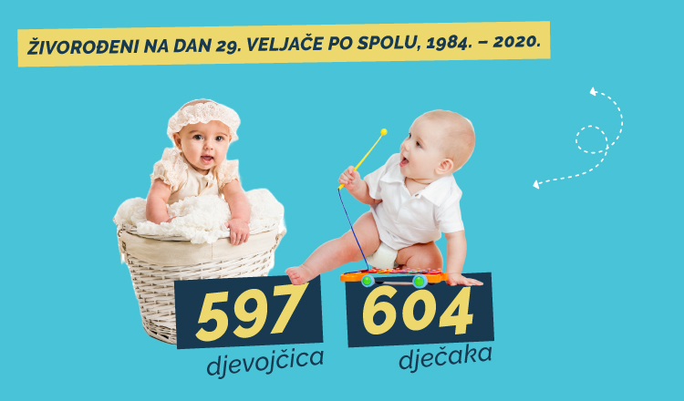 A u potrazi za rođenima na ovaj datum prošetali smo kroz podatke čak unatrag četrdeset godina, odnosno sve do 1984., i vidjeli da je otad do danas prijestupna godina s najviše živorođenih na dan 29. veljače bila 1988., kada se rodilo njih 202, a najmanje ih je bilo 2020., kada je na taj datum živorođeno ukupno 66 beba, stoji u priopćenju DZS-a.