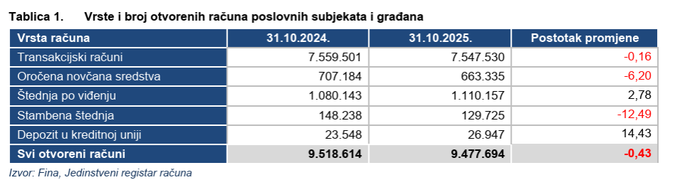 Prema podatcima iz Jedinstvenog registra računa, u hrvatskim kreditnim institucijama (bankama, štednim bankama i štedionicama), na dan 31. listopada 2025. godine, bilo je ukupno 9.477.694 otvorenih računa, što je za 0,43% manje u odnosu na 31. listopad 2024. godine.