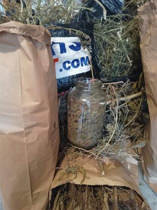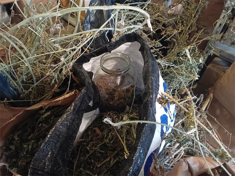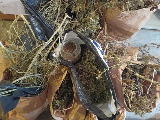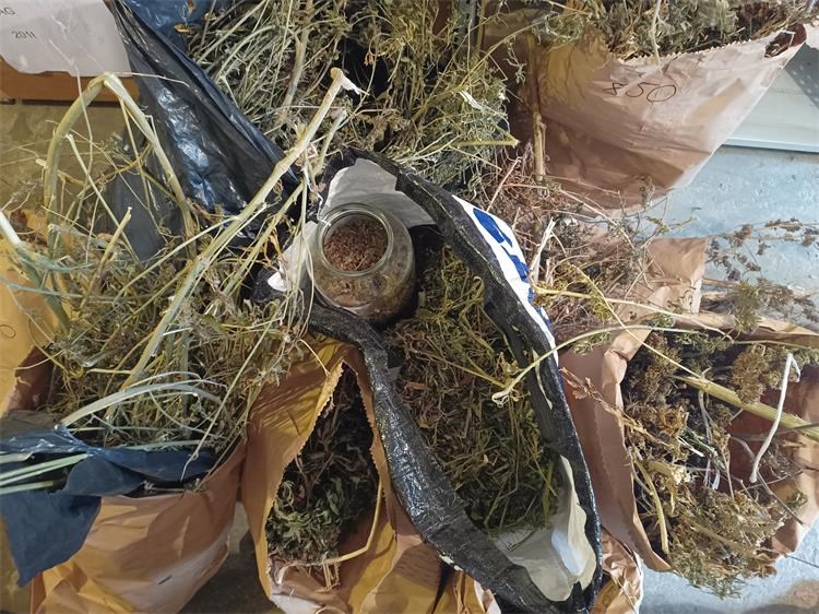 U provedenoj pretrazi pronađeno je i oduzeto oko 6135 grama stabljika zelene biljne materije nalik opojnoj drogi marihuani i oko 4956 grama suhog lišća zelene biljne materije nalik opojnoj drogi marihuani te poluautomatska puška.