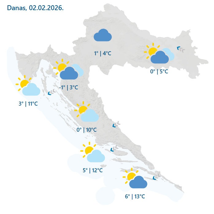 Na Jadranu će umjerena do jaka bura prijepodne slabjeti i okretati na sjeverozapadni vjetar, navečer jugo. Najviša dnevna temperatura zraka između 3 i 6, na Jadranu te u unutrašnjosti Istre i Dalmacije od 9 do 13 °C.