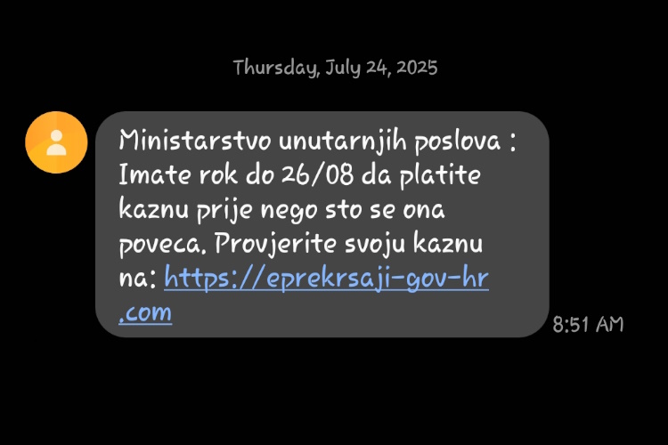 Građani diljem Hrvatske ovih dana primaju lažne SMS poruke u kojima se pošiljatelj predstavlja kao Ministarstvo unutarnjih poslova i traži plaćanje navodne kazne putem internetske poveznice. Radi se o sofisticiranoj prijevari čiji je cilj krađa osobnih i financijskih podataka građana. Policija je odmah reagirala, pozvala na oprez i potvrdila da MUP nikada ne šalje obavijesti o prekršajima putem SMS-a, a kamoli traži broj kartice i CVV kod.