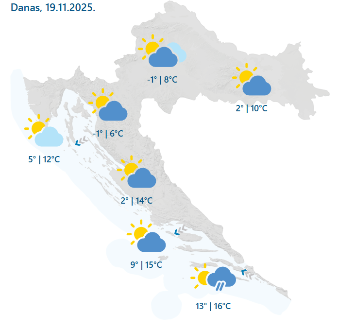 Prema prognozi DHMZ-a danas će biti djelomice sunčano s promjenljivom naoblakom. Oblačnije na jugu zemlje gdje mjestimice može pasti i malo kiše. Vjetar na kopnu većinom slab. Na Jadranu slaba do umjerena bura, a prema kraju dana jugo i južni vjetar. Najviša dnevna temperatura između 6 i 11, na moru od 12 do 17 °C.